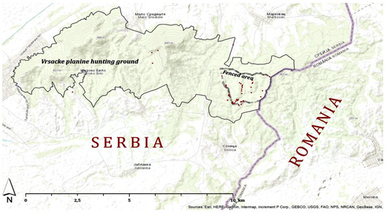 The research was conducted in the wild boar hunting grounds “Vršačke planine” (altitude from 200 to 641 m) in Vojvodina Province, Serbia. The investigated hunting area (4118.38 hectares) includes an open and enclosed fenced part (301.67 ha). The total number of wild boars was 253, including 73 in the open hunting area and 180 in the fenced area. The fenced part of the hunting ground is secured with a single wire mesh fence (height 2.20 m), with wooden posts at 3 m. The wire mesh fence is interspersed with natural water surfaces (streams, flash floods). Protective metal grates have been placed at the stream entrance to prevent other wildlife from entering while allowing the free flow of water. The hunting ground is surrounded by other open hunting grounds managed by local hunting clubs. The eastern side of the fenced part of the hunting ground is only 500 m from the Serbian–Romanian border (Figure 1).