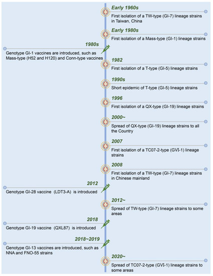 A timeline with the date of isolation of each presenting IBV strain and used live-attenuated vaccines in China is shown in Figure 2. Suspected IB was first described in 1972 in Guangdong province, China [64]. Early in the 1980s, Mass-like IBV was isolated from Chinese chicken flocks that were genetically similar to that found in the USA. To control the diseases in chickens, the inactivated and live-attenuated vaccines of Mass (H52 and H120) and Conn serotypes were used. The IBV strains from T-type (GI-5), QX-type (GI-19), TC07-2-type (GⅥ-1), and TW-type (GI-7) were successively isolated from the vaccinated chicken flocks [65,66,67]. Currently, GI-19 (QX-type) and GⅥ-1 (TC07-2-type) lineage strains have become the dominant strains of IBV in China [68,69,70].