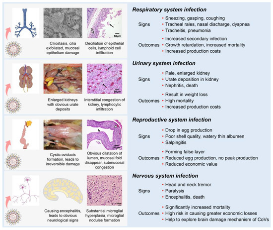 IBV infection can induce obvious respiratory and reproductive symptoms as well as increased mortality in chickens, especially when secondary infections of bacteria or viruses occur. “Multiple symptoms with one virus” caused by IBV affects chickens of various types and ages globally and most likely will continue to be a serious threat to the global poultry industry.