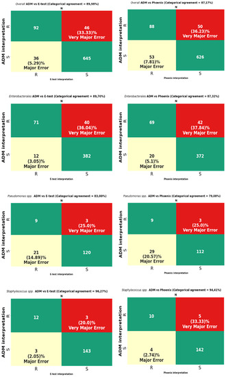 - major errors (ME) when the strain turns out to be sensitive using the ADM and resistant using the evaluated method.