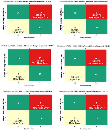 Other authors have also studied the CA between the E-test and the ADM. Results similar to ours were achieved by Van den Bijllaard et al. in their studies on E. coli and Klebsiella spp., who reported a CA of 99% and 84.8%, respectively [33]. These authors also showed a high VME rate (although lower than in our study), amounting to about 23% for both types of bacteria [33].