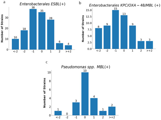 MIC deviations obtained by the E-test compared to the reference method. Number of results with one, two, or more than two two-fold dilutions for multidrug-resistant rods: ESBL-producing Enterobacterales (n = 139) (a), carbapenemase-producing Enterobacterales (n = 60) (b), and MBL-producing Pseudomonas spp. (n = 21) (c);−1, −2, > −2, 1, 2, 3—deviations of one, two, or more than two two-fold dilutions bellow or above the MIC in comparison with ADM method (0).