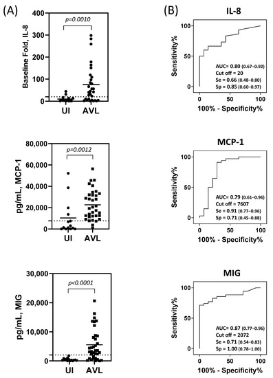 Chemokine production in supernatants of cultured PBMCs from study participants. (A) Production of chemokines following 72 h of SLA stimulation of PBMC from individuals with asymptomatic visceral leishmaniasis (AVL+) and uninfected (UI, AVL negative) military healthcare beneficiaries. Biomarkers IL-8 (UI, n =14 and AVL, n = 30); MCP-1 (UI, n =14 and AVL, n = 34), and MIG (UI, n =14 and AVL, n = 35). Horizontal bars represent the mean concentration for each biomarker. Dashed lines represent the cut-off. The identification of the cut-point value requires a simultaneous assessment of sensitivity and specificity. A cut-point will be referred to as optimal when the point classifies most of the individuals correctly. (B) Receiver operating characteristics curve analyses to determine the performance of these analytes as potential biomarkers for AVL. AUC = area under the curve, se = sensitivity and sp = specificity. Statistical analyses were performed using Mann–Whitney U test.