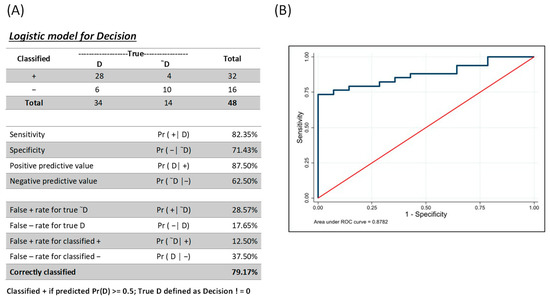 To determine whether a combination analysis of the MIG and MCP-1 biomarkers would increase the analyte performance, we generated a combined ROC using the lroc function and post-estimation for logistic regression in Stata (generation of the marker combinations based on se and sp filters) as described by [35]. Using a multiple logistic regression where all biomarkers were used as predictors, a resulting predicted probability of 0.5 was considered a case- or disease-positive observation (Figure 2). Using that as a cutoff, the model correctly classified 79.17% of the observations, with a sensitivity and specificity of 82.35% and 71.43%, respectively (Figure 2A). The ROC curve provided (Figure 2B) is a visual representation of all possible combinations of sensitivity and specificity from these inputs, with a possible AUC of 87.82%.