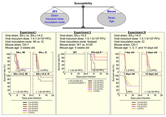 Variation in mouse susceptibility to JEV infection. Results from three mouse infection experiments are presented, demonstrating that the level of susceptibility of mice to JEV infection, primarily based on the mortality rate, is determined by multiple factors, such as the viral strain (SA14 vs. SA14-14-2), inoculum dose (1.5 to 1.5 × 105 PFU/mouse), and inoculation route (intramuscularly [IM] vs. intracerebrally [IC]), as well as the mouse strain (wild-type [WT] vs. A129) and age (1, 3, 7, and 14 days). In each experiment, mortality was recorded for 24 days after infection. Experiments I and III are reproduced from our previous published report [103], and Experiment II is our unpublished data.