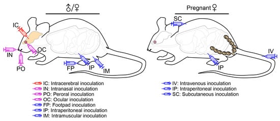 A natural JEV infection in human and animal hosts occurs principally through an intradermal or subcutaneous route, when they are bitten by an infected mosquito [229]. An experimental JEV infection in mice, on the other hand, can be performed through one of several different inoculation routes (Figure 3), depending on the purpose of the experiments. In some cases, it may not reflect the natural infection, but the virus can still cause fatal encephalitis.