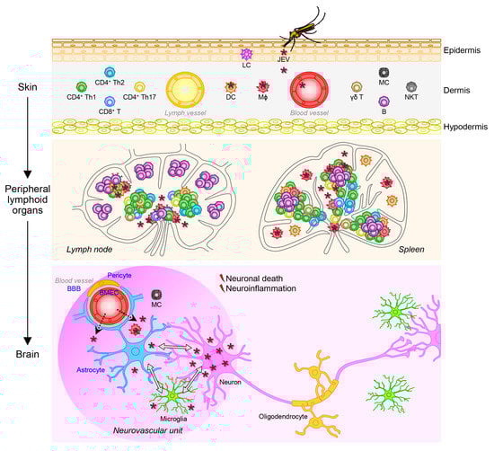 A working hypothesis for how JE, an acute inflammatory CNS disease, is caused by a mosquito-borne JEV infection. The infection begins with the bite of an infected mosquito that injects the virus from the salivary glands into the host’s skin, the dermis, where the virus presumably infects mononuclear phagocytes. From the dermis, the infected cells and cell-free virions may migrate through lymph and blood vessels to peripheral lymphoid organs, where the virus probably replicates in mononuclear leukocytes. Following viral amplification in peripheral lymphoid organs, JEV can spread into many other organs through the vascular system. In brains, JEV may cross the BBB to enter the brain parenchyma, where the virus replicates almost exclusively in neurons, causing neuronal death and activating glial cells. The activated glial cells then release numerous inflammatory mediators involved in various neuropathologic events, such as bystander neuronal death, neurogenesis impairment, BBB breakdown, and leukocyte infiltration. These neuropathologic events cause the worsening of both neurodegeneration and neuroinflammation.