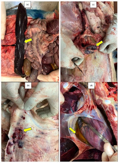 Pathology of the selected swine carcasses used for composting. Enlarged and hemorrhagic spleen (a) and lymph nodes (b). Necrotic lesions on/under the skin of the abdomen (c). Excess of yellow fluid in the heart (d).