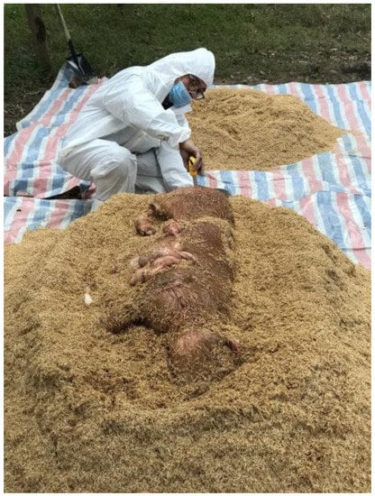 Composting is an effective and economical method of carcass management [,,]. Compost is a biologically active process involving many different types of nonpathogenic bacteria, fungi, and actinomycetes decomposing organic materials [,]. These organisms compete with pathogenic organisms for resources and create metabolic heat. The competition for resources, along with the heat, are important factors for the inactivation of pathogenic organisms []. Previous studies demonstrated that composting was able to inactivate dangerous viruses, including the foot and mouth disease virus (FMDv) [] and the porcine epidemic diarrhea (PED) virus [].