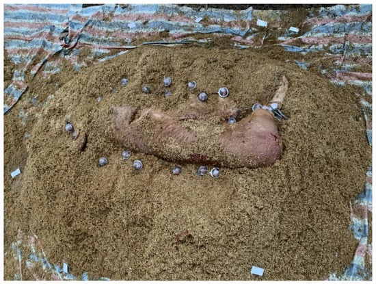 Each compost pile was composed of approximately 7–8 cubic yards of carbon material (rice hulls or sawdust) with 1 infected hog carcass of 60–80 kg. Carbon material (40 cm) was used to form the base of each compost pile. Next, an infected pig carcass was placed on top of the carbon layer (Figure 3). The first set of 21 Dacron in situ bags (Ankom, NY, USA) containing spleen tissue and 3 Dacron bags containing femur bone was then placed around the carcass at the pile core (Figure 4). The carcass was then covered with 30 cm of carbon material, either rice hulls or sawdust and the second set of Dacron bags (21 bags) was placed at this level, in the pile top. In this study, each sample bag was placed in a tea strainer attached to a metal cord to facilitate retrieval. Lastly, 30 cm of carbon material was added on top of the second set of Dacron bags. The entire compost pile was covered with approximately 3.0–4.0 cubic yards of carbon material.