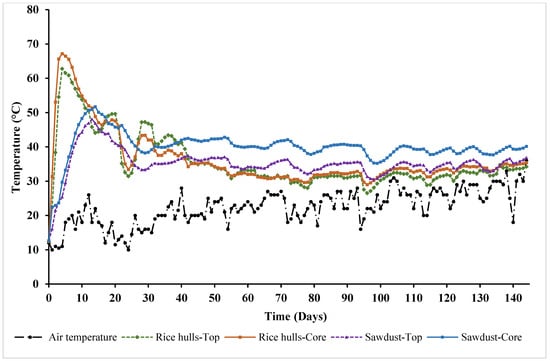 Temperature profiles of compost piles using rice hulls (RH) and sawdust (SD) as carbon materials are shown in Figure 6. For RH, temperatures at the core were higher than those at the top for the first 2 weeks. Core temperatures increased sharply and reached a peak of 67.2 °C on day 4. Similarly, the top temperature also rapidly increased and reached the highest point (62.8 °C) on day 4. Both temperatures exhibited a downward trend after day 4 but remained above 50 °C until day 12. Compared to RH, the temperature of SD was lower during the first 12 days. Figure 6 shows that temperatures of SD rose more slowly but also decreased more slowly compared to those of RH. The core temperature of SD reached a peak of 51.72 °C on day 14, while the highest temperature at the top position was 48.08 °C, observed on day 13. For the first 10 days, temperatures at the top and core of SD were quite similar. However, the temperature at the core remained noticeably higher than that at the top from day 11 to day 144. Regardless of the carbon material, temperatures of the compost piles were much higher than the air temperature throughout the experiment (Figure 6).