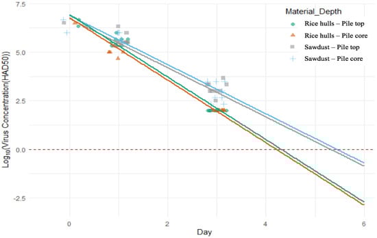 The fitted lines were extrapolated past the range of observable data to visualize when this model predicts total virus decay at a concentration of 1 HAD50 (Figure 7 and Table 1). The mean virus concentration in the population for sawdust at the pile core is estimated to decay to 1 HAD50 in 5.3 days, with 999 out of 1000 pigs reaching 1 HAD50 by 6.3 days. The mean virus concentration in the population for sawdust at the pile top is estimated to decay to 1 HAD50 in 5.4 days, with 999 out of 1000 pigs reaching 1 HAD50 by 6.4 days—slightly longer than at the core. The decay for rice hulls was a little more than one day faster, with the mean virus concentration in the population estimated to decay to 1 HAD50 in 4.2 days at the core and 4.3 days at the top. The predicted time to decay for individual pigs for rice hulls shows that 999 out of 1000 pigs reached 1 HAD50 by 4.9 days at the pile core and 5.0 days at the top (Figure 7 and Table 1).