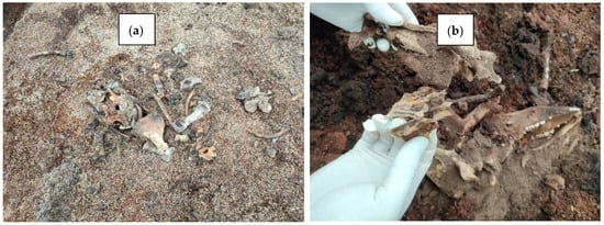 The excavation of compost piles at day 144 showed that whole carcasses were almost completely degraded in both RH and SD. The carcass’s soft tissue was entirely decomposed, with only large bones remaining visable, most of which had become spongy in texture (Figure 8a,b).
