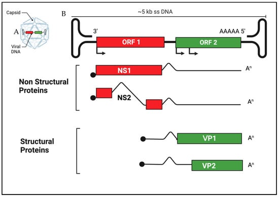 Schematic representation of canine parvovirus prototype (CPV-2, genus Protoparvovirus) (A). ORFs organization of genome and its transcriptional strategy (B). The genome presents terminal palindromic sequences that form complex hairpin structures at the 5′ and 3′ ends. These structures serve as the origin of DNA replication and help encapsidation (packaging) of viral DNA. The 5′ ends of RNA transcripts are capped (black circles), and the 3′ ends are polyadenylated (An). VP1 and VP2 are encoded in the same mRNA.