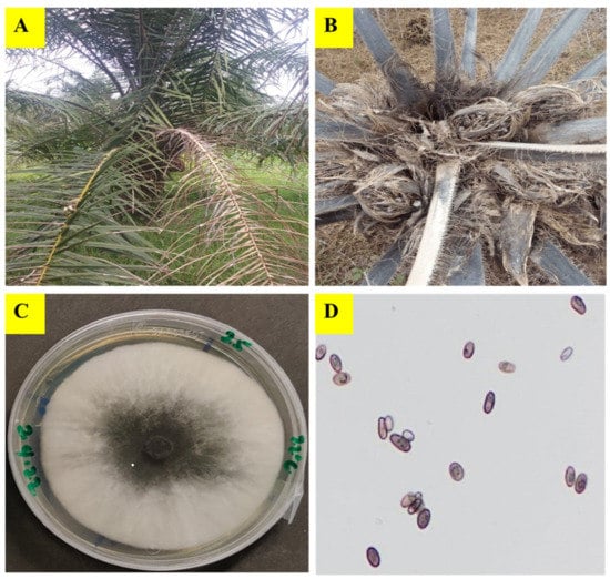 A dry basal rot-infected oil palm showing fracture of the lower fronds (A). A cross section of a dry basal rot-infected oil palm showing fruit bunch rotting symptom (B). A pure culture of Thielaviopsis paradoxa (C). Microscopic view of two ascospore types produced by T. paradoxa (D).