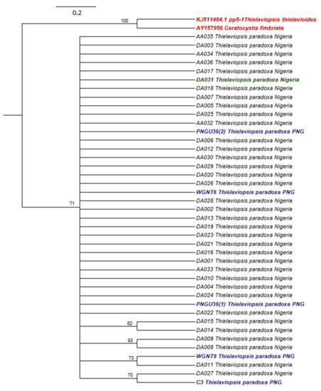 The previous phylogenetic studies of some species in the genus Thielaviopsis categorized the taxon according to geographical origin into four distinct clades: the North American [31], Latin American [32,33], African [19,34] and Asian-Australian clades [31,35,36]. Similarly, there is growing evidence from DNA sequence studies that Ceratocystis, the recognized sexual states of Thielaviopsis (according to the dual nomenclature system), consist of species complexes with marked phylogenetic lineages with members sharing related eco-morphological characteristics making them worthy of being considered distinct genera [31,37,38]. Identification of fungi based on morphological and physiological characteristics was the foremost approach in fungal systematics until the advent of PCR-based molecular techniques. PCR has solved the inherent problems with the traditional classification including the unique nature of fungi which poses a tremendous problem to the phenotype-based classification [39]. In recent times, several molecular techniques for fungal identification have been reported. These include fluorescent in situ hybridization (FISH), denaturing gradient gel electrophoresis (DGGE), DNA array hybridization, pulse-field gel electrophoresis (PFGE), terminal restriction fragment length polymorphism (T-RFLP) and DNA sequencing-based techniques which are the most frequently used [40,41,42]. There is continued interest in the use of DNA barcoding as an identification tool for fungi species due to its fastness and accuracy [43,44]. The use of a rDNA-internal transcribed spacer (ITS) as a DNA barcode for intraspecific fungi has received considerable attention in the recent time due to the conservativeness of its sequence and ability to explore abundant site variabilities [45,46]. Many research works have documented the use of ITS and other molecular markers in resolving taxonomy issues and for phylogenetic reconstruction in many species of organisms including fungi. Alvarez et al. [47] studied the genetic diversity of some strains of Thielaviopsis paradoxa from Ecuador, Colombia and Brazil using random amplified polymorphic DNA (RAPD) markers and PCR sequencing of the internal transcribed spacer (ITS) region of 5.8 S ribosomal DNA (rDNA) and found that the population is predominantly clonal. Similarly, Borges et al. [48] were able to characterize T. ethacetica isolates based on phylogenetic analyses of both ITS and TEF-1 amplified gene sequences whereas the analysis of the sexual and asexual phases of the isolates with morphological markers failed to confirm the identity of the fungus. Parsimony analyses of the sequences of the ITS and the large subunit (LSU) of the nuclear rDNA have recognized some Thielaviopsis species as a monophyletic group. Among these species, only T. populi, T. ovoidea and T. thielavioides which show identical morphology have been revealed to be discreet by the analyses of their rDNA sequences [20].