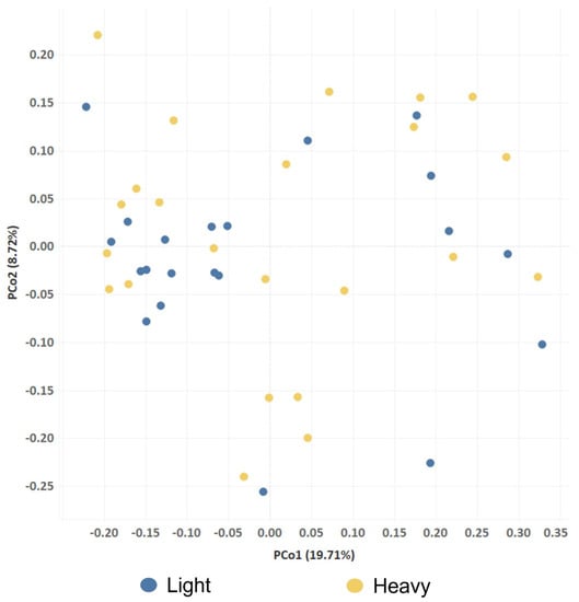 Comparison of fecal bacterial communities between light and heavy barrows using principal coordinate analysis (PCoA). PCoA was performed using a Bray-Curtis distance matrix. The x and y axes correspond to principal components 1 (PCo1) and 2 (PCo2).