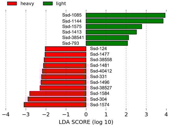 OTUs identified by LDA effect size (LEfSe) [] as characteristic of heavy and light pigs, respectively. The abundance and taxonomic affiliation of these OTUs can be found in Supplementary Table S4.