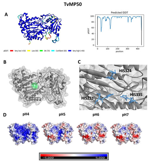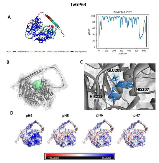 Three-dimensional model for TvGP63 of Trichomonas vaginalis. (A) PIDDT values for the amino acid sequence of the structure modeled using Alphafold. (B) Active site, represented by the green marking. (C) Identification of amino acids from the enzyme’s active site (D) Electrostatic charge on the surface of the TvMP50 calculated for pHs 4 to 7. The red-white-blue scale refers to the minimum (−5 kT/e, red) and maximum (5 kT/e, blue) potentials of the surface.