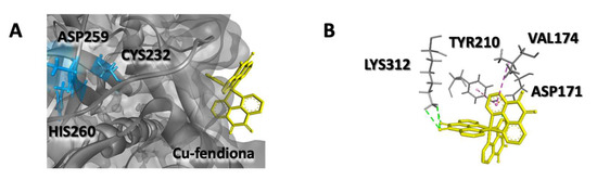(A) Docking pose with lower absolute energy (kcal·mol−1) and (B) 3D interaction diagram of the Cu-phendione with the amino acids of TvCP2 from Trichomonas vaginalis.