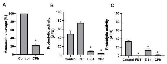 Considering the interaction of Cu-phendione with the main trichomonad MPs, the effect of this compound in the enzymatic profile was evaluated further. Azocasein is one of the most reliable substrates for measuring proteolytic activity, as it has good color stability and no need for chromogenic reagents [34]. The same methodology used to characterize T. vaginalis peptidases has been used to evaluate the trichomonacidal effects of compounds such as 2,4-diamine-quinazoline derivative [27,35]. As shown in Figure 5A, trophozoites treated with Cu-phendione had a significant reduction (77.14%) in their ability to degrade the casein substrate compared to untreated parasite cells, demonstrating an important inhibitory effect on the peptidase pool.