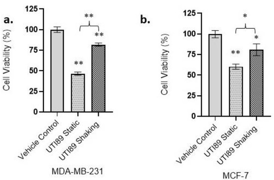 Statically grown UTI89 demonstrated significantly higher levels of cytotoxicity on highly metastatic breast cancer cells MDA-MB-231 compared to weakly metastatic breast cancer cells MCF-7. The incubation of MDA-MB-231 cells with UTI89 grown under shaking or static conditions (a) revealed a reduction in cell viability, with a significantly higher reduction in viability with static UTI89 (45.90% ± 1.9 viability vs. control, p < 0.01; n = 3). The incubation of MCF-7 cells with UTI89 grown under static conditions (b) revealed a significant reduction in cell viability (60.31% ± 3.10 viability vs. control, p < 0.01; n = 3). The reduction in cell viability was stronger for MDA-MB-231 (viability: 45.90%, p < 0.01 vs. control) compared to MCF-7 (viability: 60.31%, p < 0.01 vs. control). The incubation of MDA-MB-231 and MCF-7 cells with UTI89 grown under shaking conditions caused less reduction in cancer cell viability compared to statically grown UTI89 (MDA-MB-231: p < 0.01; MCF: p < 0.05; vs. control; n = 3). Data represented as ± S.E.M. (**: p < 0.01; *: p < 0.05).