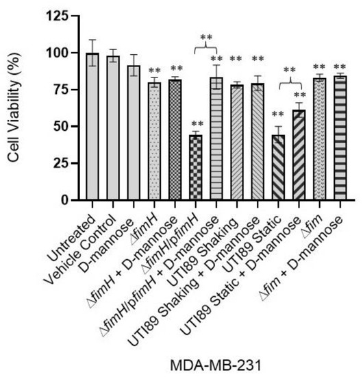 D-mannose inhibits the UTI89-mediated, FimH-dependent cytotoxicity of strongly metastatic human breast cancer cells. Various genetic constructs of UTI89 were incubated with MDA-MB-231 breast cancer cells with or without D-mannose preincubation. The constructs encoding fimH reduced the viability of cancer cells; however, the preincubation of these bacterial cells with D-mannose interfered with the cytotoxicity. Data represented as ±SEM (**: p < 0.01; n = 3).