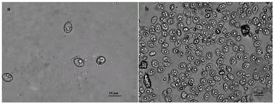 Examination of the intestinal mucosa samples of Accipiter hawks under a light microscope revealed Sarcocystis spp. infection in 25/32 (78.1%) tested birds. All examined Goshawks harboured sporocysts and/or sporulated oocysts of Sarcocystis spp. (16/16, 100%). Through microscopical analysis, Sarcocystis spp. were detected in 9 of 16 (56.3%) tested Sparrowhawks. No unsporulated oocysts were detected in both species investigated. Free sporocysts of Sarcocystis spp. in mucosal scrapings of Goshawk measured 13.0 × 9.2 μm (10.5–15.6 × 6.6–11.8 µm; n = 146) (Figure 1a), whereas sporulated oocysts were ellipsoidal in shape, contained two sporocysts, and measured 12.3 × 18.3 μm (10.5−14.5 × 11.7−21.7; n = 63). Meanwhile, sporocysts of Sarcocystis spp. in Sparrowhawk measured 11.9 × 8.1 μm (10.7–13.9 × 7.2–9.2; n = 130) (Figure 1b), while sporulated oocysts were 10.7 × 14.1 (10.6–13.6 × 14.0–17.0; n = 41) in size. Thus, the sporocysts and sporulating oocysts found in different species of hawks overlapped in size.
