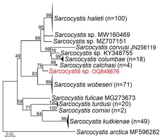 The phylogenetic tree of selected Sarcocystis spp. showing the close relationships of Sarcocystis spp. (displayed in red) obtained in the current work with S. calchasi. Since three sequences of Sarcocystis spp. were identical (OQ848676–OQ848678), only one was used for the phylogenetic inference. The tree was constructed based on ITS1 sequences and using the maximum likelihood method. The bootstrap support vales are presented next to branches. The number of sequences are shown in brackets. The multiple sequence alignment contained 271 taxa and 471 aligned nucleotide positions, including gaps.