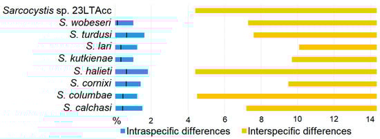 The comparison of intraspecific and interspecific genetic differences of identified Sarcocystis spp. within analysed fragments of ITS1 region. The black vertical lines display the mean vales of intraspecific genetic differences expressed in percentages.