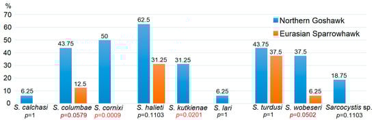 Overall, 48 and 14 sequences of Sarcocystis spp. were obtained by examining the Goshawk and Sparrowhawk, respectively. However, differences in the proportion of infected birds by means of DNA analysis were small compared to Goshawk 12/16 (75.0%) and Sparrowhawk 11/16 (68.8%). Two Accipiter hawks differed in the detected parasite species richness and infection rates of Sarcocystis spp. (Figure 4). Only four species were identified in the Sparrowhawk, as compared to nine Sarcocystis spp. determined in the Goshawk. The prevalence of certain species detected varied from 6.25% (1/16) to 62.5% (10/16). A higher infection rate of all identified Sarcocystis spp. was established in Goshawk. Nevertheless, statistically significant differences were determined only when comparing the prevalence of S. cornixi and S. kutkienae among two Accipiter species, while marginal differences were estimated in the case of S. columbae and S. wobeseri.