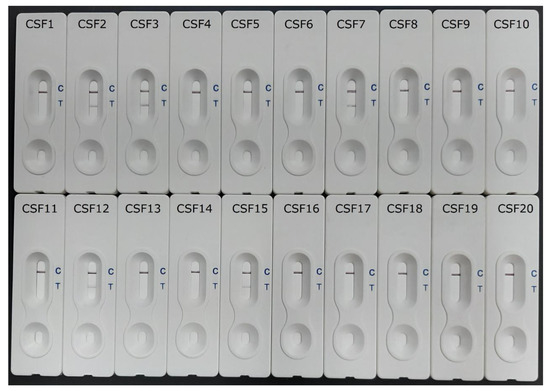 The AcAgQuickDx detection results of 20 CSF samples from clinically diagnosed cases with positive immunoblot (antibody) test for angiostrongyliasis (CSF1–10), clinically suspected cases with negative immunoblot test (CSF11–15), and CSF samples with positive immunoblot (antibody test) for gnathostomiasis (CSF16–17), and with ELISA-positive cases of Taenia solium neurocysticercosis (CSF18–20). The appearance of a red band at the T line and a red band at the C line indicates a positive sample for the detection of the specific 31-kDa Angiostrongylus cantonensis antigen (CSF2, 3, 7, 12 and 15), whereas the absence of a red band at the T line and appearance of a red band at the C line indicates a negative sample (CSF1, 4, 5, 6, 8–11 and 13–14 and 16–20).