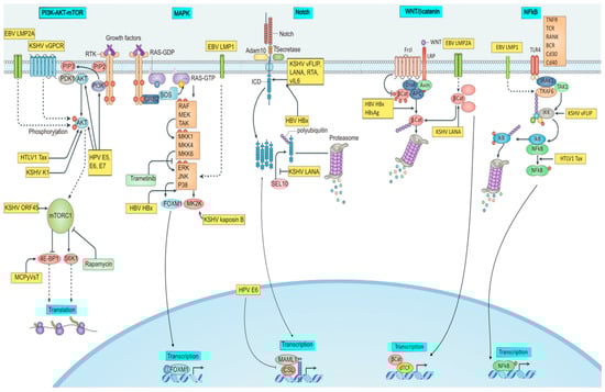 According to the cellular milieu and tissue milieu, changes in the Notch signaling system may either promote or repress tumorigenesis [134]. Notch signaling has been linked to the emergence of breast cancer, chronic lymphocytic leukemia, and B cell malignancies [135]. In contrast, pancreatic cells and skin epithelia may limit tumor growth due to notch signaling. The diverse relationship of Notch signaling with various malignancies is mirrored in a range of ways; therefore, viruses utilize this route in contrast to the pathways examined in the preceding sections, which are essentially elevated in all cancers. Notch signaling was discovered to be a crucial pathway that is targeted by HPV, MCPyV, and EBV oncoproteins, highlighting its significance in viral tumorigenesis [136]. Through the targeting of mTOR, which normally responds to a network of stimuli comprising amino acid ingestion and environmental stress, each of these biologically distinct viruses causes anabolism.