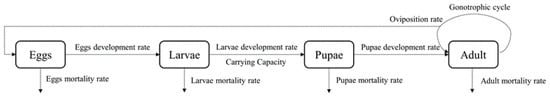 To accurately simulate the mosquito population fluctuations, the model accounts for the time spent in each life history stage during the aquatic or immature portion of the mosquito life cycle, as shown in Figure 1. The development rates of these stages are temperature-dependent, with warmer temperatures resulting in faster development. The temperature-dependent rates were determined from experimental data [5,8,10]. In addition to temperature, the effect of precipitation on the mosquito population is increased through the carrying capacity of the location: more rainfall equates to greater availability of habitats or more containers filled with water. Alternatively, less rainfall in some urban areas results in more irrigation or water storage, leading to an increase in filled containers, but this is location dependent. The equations that describe the life cycle of the mosquitoes are non-Markovian, meaning that transition times to new stages in the cycle are not exponential random variables. The transition to a new stage happens when the development of a current stage is complete. Moreover, the development rates are strongly temperature-dependent, and temperature changes throughout the year. Therefore, we use integral equations to describe the life cycle of the mosquitoes accurately.