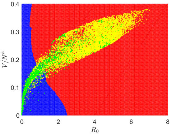 In Figure 2, we show the data used for training as green and yellow dots, indicating low (0) and high (1) transmission, respectively. The neural network classifier is a nonlinear model that assigns a risk value between zero and one to points on the surface defined by the predictive variables and . Within the depicted image, regions displaying risk values exceeding 0.5 are indicated by the color red, while those with values below 0.5 are represented by the color blue.