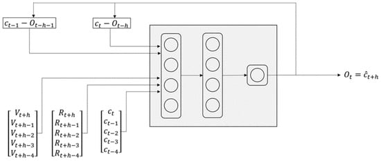 The second approach to predict weekly cases uses a recurrent neural network model, as shown in Figure 3. Assuming that the index of the current week is represented by t, the model uses a sequence of weekly new cases up to t, , as input to predict new cases in the next three weeks. In addition to the sequence of new cases, the model uses the vector population and reproductive number sequences, calculated independently using the model discussed in the previous section.