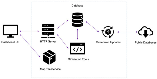 - Database: The database service consists of PostgreSQL and PostGIS [43] extensions to handle spatial queries. The database contains multiple tables to store data collected from various sources and simulation results.