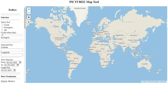 Figure 6 displays the graphical interface of the map tool, where the 2D projection map of the Earth is centrally located and where users are able to pan and zoom to their areas of interest. The interface’s left side features various tools that assist with data selection and visualization. A comprehensive guide to the description and usage of each tool is available in the PICTUREE–Aedes Users Guide in the Supplementary Material.