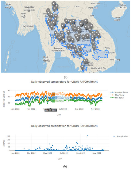 The PICTUREE–Aedes enables users to identify weather stations and their recorded data based on their preferences. Figure 7a illustrates the distribution of weather stations in Central Indochina (Ecoregion). Users can select a station and plot its precipitation and temperature data. Figure 7b demonstrates the daily temperature and precipitation data of station UBON RATCHATHANI throughout 2022.
