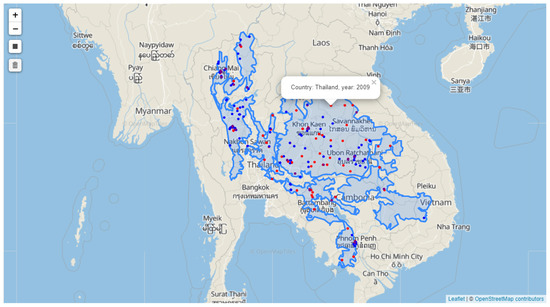 Figure 8 presents the occurrence records of dengue, Aedes aegypti, and Aedes albopictus, marked, respectively, with red, blue, and purple dots in Central Indochina. Clicking on a dot will generate a popup that displays the country name and the year of occurrence.