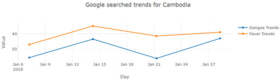 Additionally, the PICTUREE–Aedes supports the display of information on Google Trends. Figure 9 illustrates the trend of “dengue” and “fever” in Cambodia during January 2018.