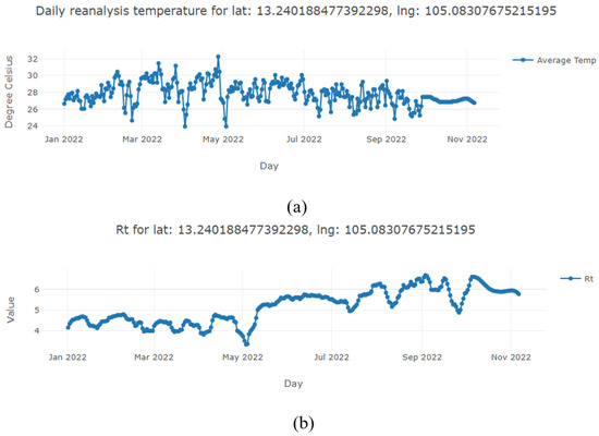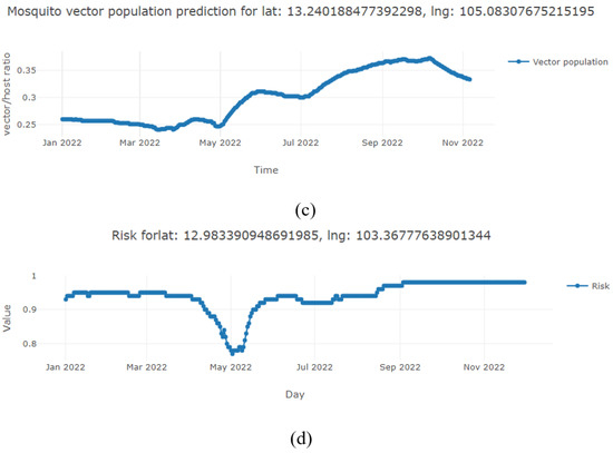 The PICTUREE–Aedes offers four types of mosquito simulation results, including daily average temperature, vector host ratio, reproduction number, and dengue risk, which can be visualized spatially and temporally. To view the data spatially, users must select a specific day, and a heat map of the selected area will display the selected data value. Figure 10 displays the average temperature (a), dengue transmission reproduction number (b), vector–host ratio (c), and dengue transmission risk (d) of the Indochina peninsula on 15 September 2022. Visualizing data beyond the next six months from the current time is limited.