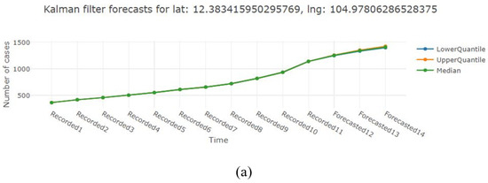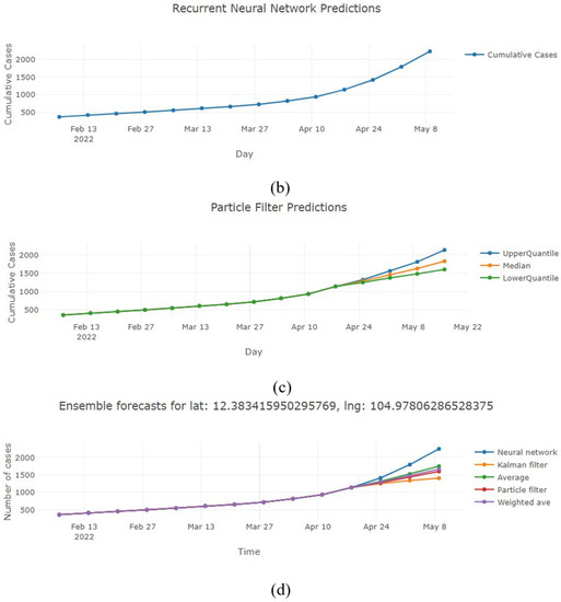 The PICTUREE–Aedes provides three types of predictive tools and their ensemble forecast. Figure 12 illustrates the predicting results of the dengue outbreak in Cambodia during 2022. The first 13 data points (before 27 April) represent weekly dengue cases, while the remaining points (including/after 27 April) denote the predictions. Figure 12a displays the distribution of SEIR-SEI-EnKF predictions for the next three weeks, including quantiles and median. Figure 12b illustrates the neural network prediction for the next three weeks. Figure 12c shows the results of the particle filter, presenting the distribution for the next four weeks. Figure 12d displays the result of the super-ensemble, showcasing the median prediction from each member, the average, and weighted average of the members.