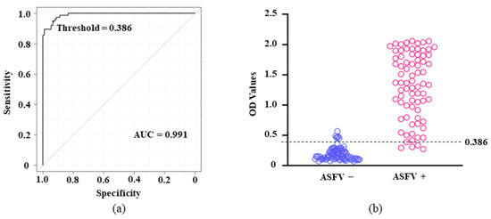 Standardization and determination of the cutoff for p11.5-indirect ELISA ROC analysis. In total, 166 pig sera (90 negative and 76 positive sera) were assayed by p11.5-indirect ELISA and IDvet indirect ELISA. (a) The AUC of p11.5-indirect ELISA was determined by ROC analysis (AUC = 0.991; 95% CI = 0.982–0.999). The threshold value (0.386) was calculated by EZR. (b) Each circle represents one serum sample of an individual pig. Values above and below the dashed line with an OD cutoff of 0.386 were considered positive and negative, respectively.