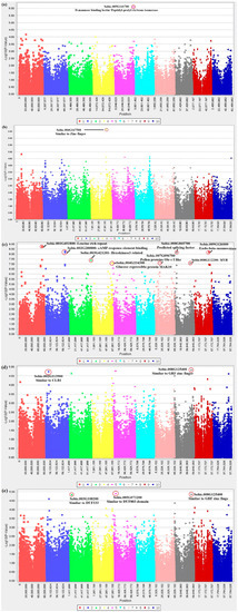 The SNPs that passed the Bonferroni correction were mapped back to the published sorghum reference genome to be tracked to the specific chromosome location based on the sorghum reference genome sequence, version 3.1.1, available at the Phytozome 13 (https://phytozome.jgi.doe.gov accessed on 5 March 2023) [27], and the top SNPs that failed to pass Bonferroni correction were also checked to identify the nearest genes from SNPs that had previously reported roles in biotic or abiotic resistance/stress responses.