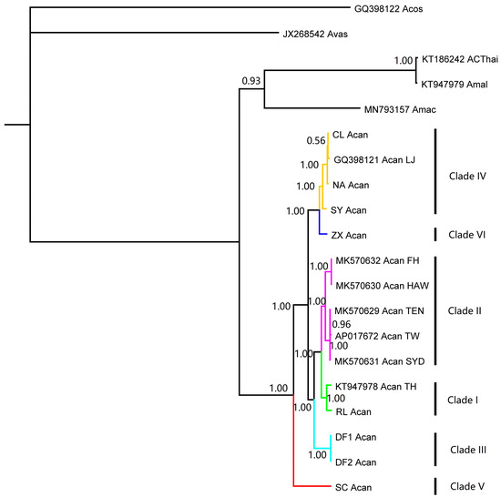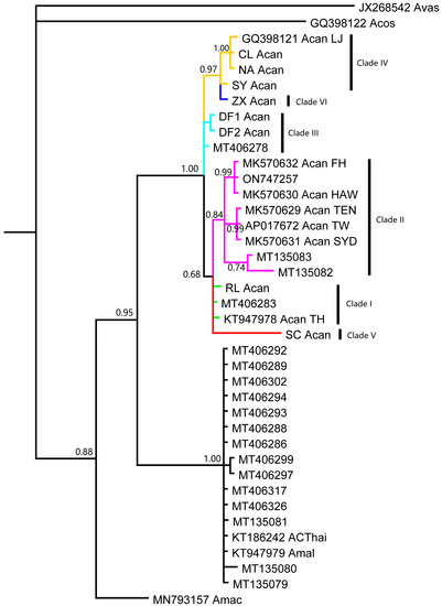 The complete mt genomes of A. cantonensis, A. malaysiensis and A. mackerrasae were used to construct phylogeny with the A. vasorum (JX268542) and A. costaricensis (GQ398122) as outgroups. A phylogenetic tree was constructed under Bayesian inference, performed in MrBayes version 3.2.7 [31]. Prior to Bayesian inference, the best fit nucleotide substitution model (GTR+G) for the dataset was determined using a hierarchical likelihood ratio test in jModeltest version 2 [32]. The posterior probabilities were calculated using Markov chain Monte Carlo (MCMC) simulations. At the end of this run, the average standard deviation of split frequencies was below 0.01, and the potential scale reduction factor was reasonably close to 1.0 for all parameters. A consensus tree was visualized and edited by Mesquite version 3.70 [36] or FigTree version 1.4.4 (http://tree.bio.ed.ac.uk/software/Figtree/; accessed on 28 May 2023).