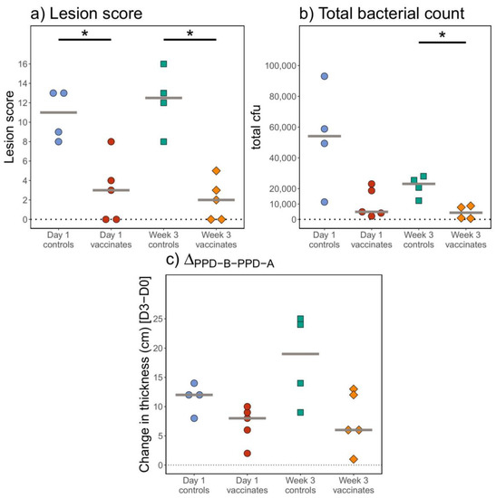 Protection conferred via BCG vaccination administered at different ages. Animals were vaccinated with BCG at day 1 of life (red) or at the age of 3 weeks (orange) and were challenged with M. bovis 5–6 months later. Age-matched controls are shown for both groups in blue (for day 1) and green (for week 3) (x-axis). (a) Total lesion scores at necropsy 13 weeks post-M. bovis challenge (y-axis). (b) Total M. bovis bacterial counts in colony-forming units (cfu) (y-axis) in tissues taken post-mortem from BCG-vaccinated and control animals. (c) Tuberculin skin test (PPD-B–PPD-A) responses are depicted on the y-axis with PPD-B-specific changes in skin thickness at day 3 minus the thickness at day 0. * p-value < 0.05.
