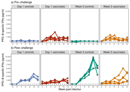 IFN-γ secreted in whole blood supernatants following 24 h of stimulation with bovine tuberculin (PPD-B) expressed in picograms per millilitre (pg/mL, y-axis). Calves were vaccinated at day 0 (red) and week 3 (orange) of life with BCG Pasteur. Age-matched control animals (blue for day 0 and green for week 3) were non-vaccinated. Immune responses were monitored for 12 weeks post-BCG vaccination (a) and post-M. bovis challenge (b).