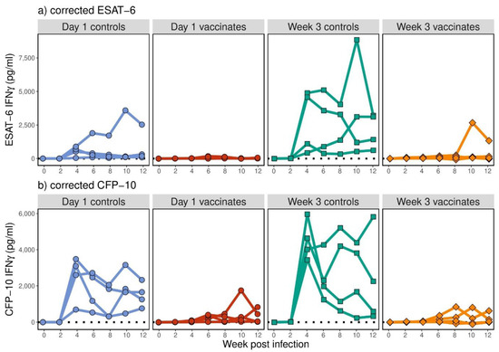No ESAT-6- or CFP-10-specific IFN-γ was detected prior to challenge with M. bovis in any of the animals across all four animal groups (data not shown). Post-M. bovis challenge, the ESAT-6- (Figure 3a) and CFP-10-specific (Figure 3b) IFN-γ responses were highly variable, with some animals demonstrating high-level secretion of antigen-specific IFN-γ, and others showing much lower levels (Figure 3). Overall, the non-vaccinated control groups did show an increase in both ESAT-6- and CFP-10-specific IFN-γ levels post-challenge (p < 0.001), but no differences were observed between the two non-vaccinated groups (p > 0.169). No significant overall changes in ESAT-6-specific IFN-γ in the BCG-vaccinated groups and CFP-10-specific IFN-γ levels in the week 3 vaccinated group were observed with time (p > 0.094). There was a significant increase in CFP-10-specific IFN-γ levels in the day 1 vaccinated group (p < 0.001), though the mean increase by week 12 was very low. ESAT-6- and CFP-10-specific IFN-γ levels did not significantly differ between the two BCG-vaccinated groups (p > 0.089), but in both the day 1 and week 3 vaccinated groups, ESAT-6- and CFP-10-specific IFN-γ levels were significantly lower than their age-matched, non-vaccinated groups (p < 0.012).