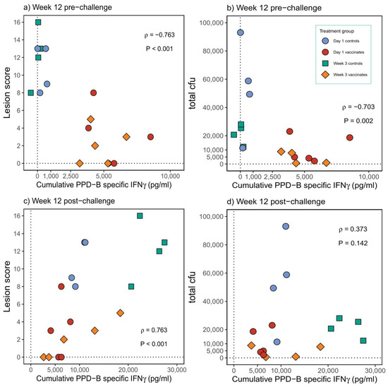 Correlation of cumulative PPD-B-specific IFN-γ (pg/mL) with total lesion scores post-vaccination (a) and post-M. bovis challenge (c) and with total bacterial count (cfu) post-vaccination (b) and post-M. bovis challenge (d).